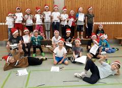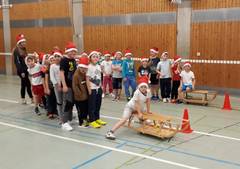 Die Turnkinder der 1. und 2. Klasse hatten viele Prüfungen vor sich. Zu Beginn mussten sie sich über tiefe Schluchten hangeln und hohe Berggipfel überwinden und das alles bei eisigen Nordpoltemperaturen. Danach ging es über einen „zugefrorenen See“ mit anschließender rasanter Schlittenfahrt. Auch mussten die zukünftigen Helferlein auf rutschigen Dächern balancieren und natürlich wurde auch der Sprung in den Schornstein verlangt. Alle Kinder waren mit vollem Eifer dabei und konnten zum Abschluss ein Diplom und ein kleines Geschenk entgegennehmen. Weihnachten kann also kommen.